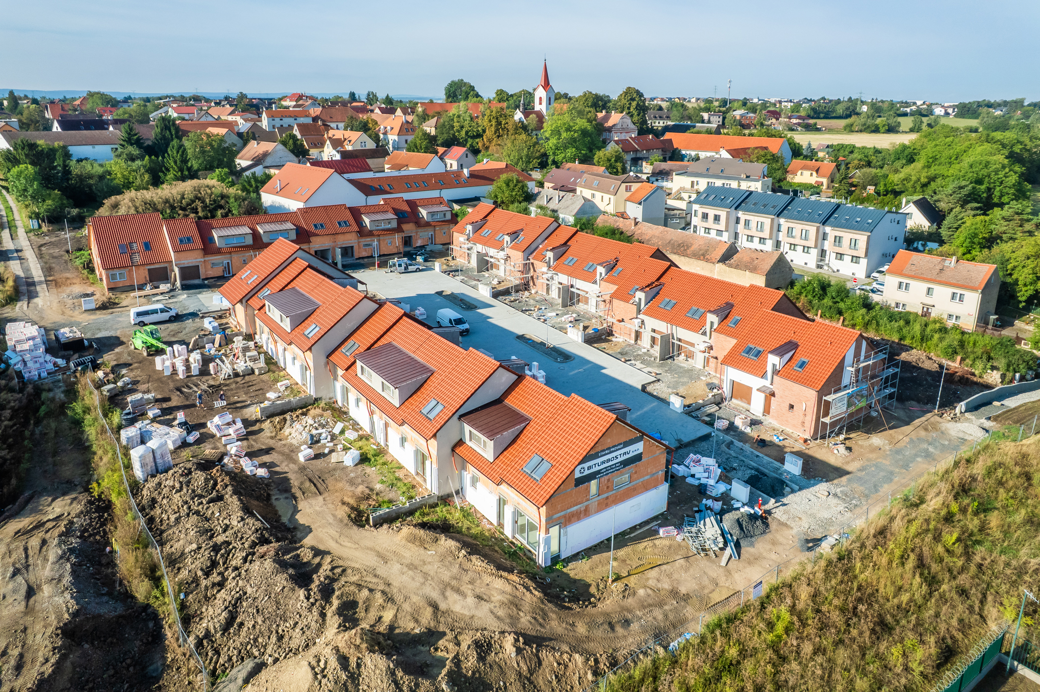 V prvních domech právě dokončujeme obklady v horních koupelnách – ladíme detaily, které promění prostor v příjemné zázemí pro každodenní relax. Zároveň probíhá kompletace vnitřních elektrorozvaděčů, bez kterých by to doma zkrátka nefungovalo.